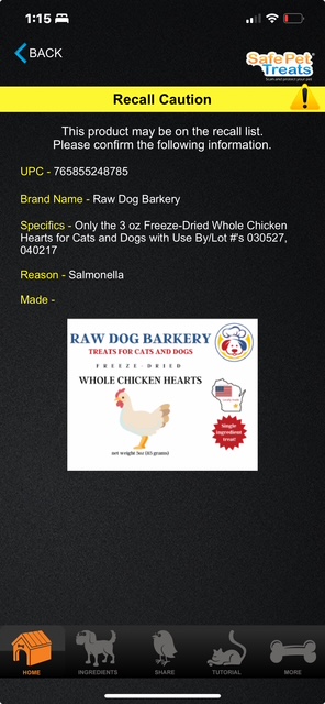 – UPC 765855248785 for the 3 oz Freeze-Dried Whole Chicken Hearts for Cats and Dogs with Use By/Lot #’s 030527, 040217
