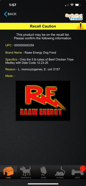 - The FDA recommended Raaw Energy recall the eight lots due to contamination with pathogenic bacteria. To date, the firm has not initiated an adequate recall of affected products. Consumers who have purchased Raaw Energy dog food should check packaging for the affected date codes prior to feeding to pets.