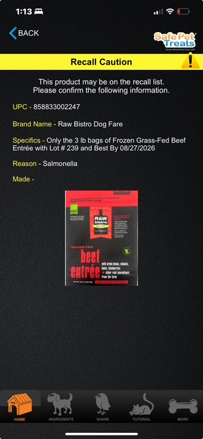 - Raw Bistro Dog Fare Grass-Fed Beef Entrée, Frozen – 3 lb bags (UPC 858833002247) Lot 239, Best By 08/27/2026.